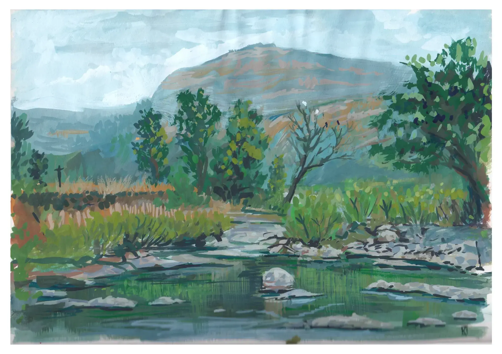 The return trip of this trek was equally exhilarating like the trek to the caves up the mountain. There is Ulhas river at the base of the mountain and it has small village near its banks. The calm and rustic environment was really inspiring. I had brought a sketchbook and some gouache for painting, so we sat down on a rock near the river and started to paint.