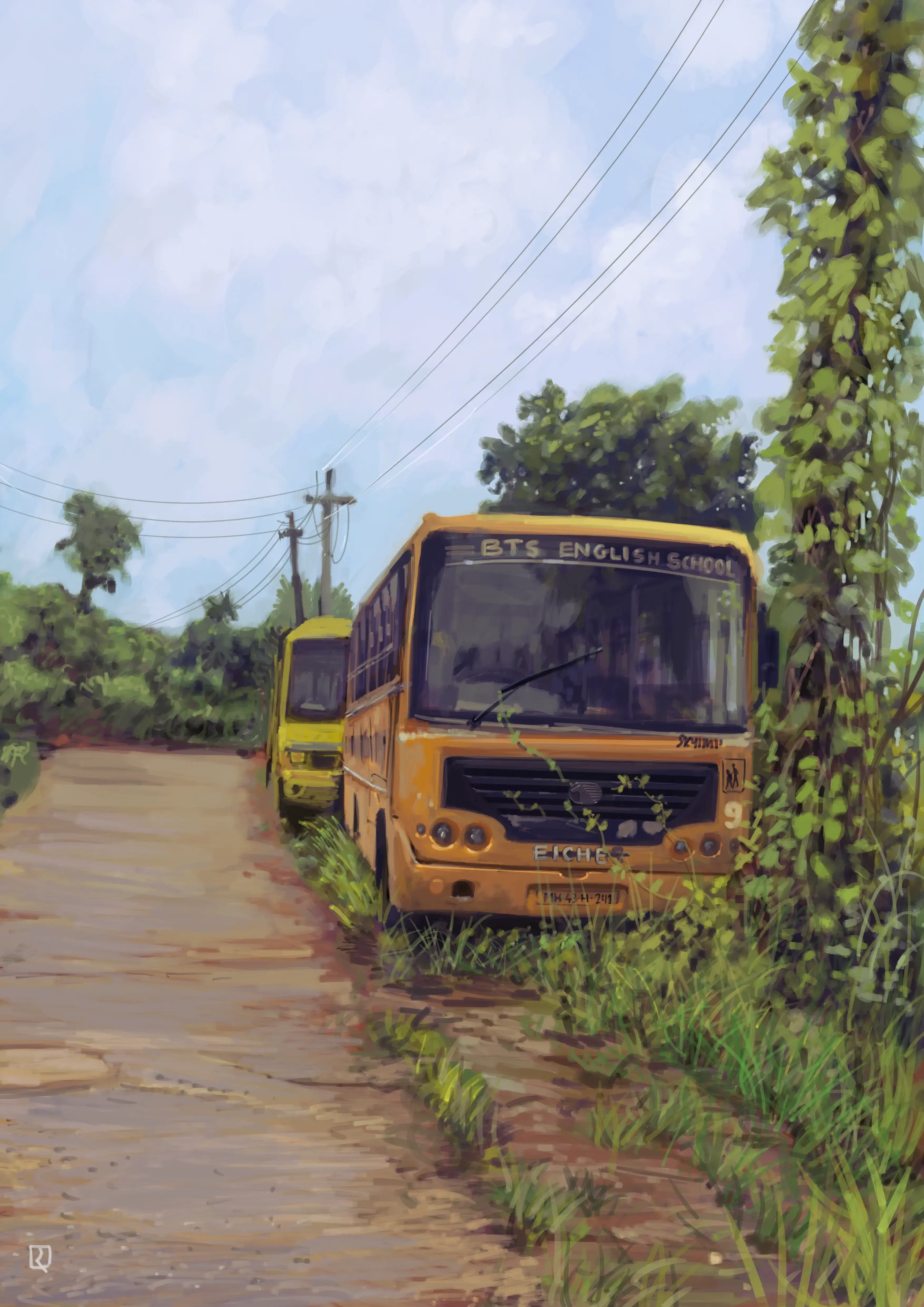 Some school buses parked since start of the pandemic near my house. Its been a while since children saw school. Instead of a landscape I thought why not paint some vehicles, so I did this outdoor study.